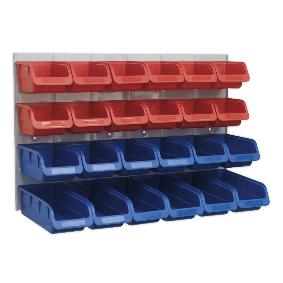 Manufactured from shockproof polymer which is resistant to mild acids, solvents and oils. Bins have a high thermal stability and resist damage from extremes of temperature. Supplied with heavy-duty steel back panel.