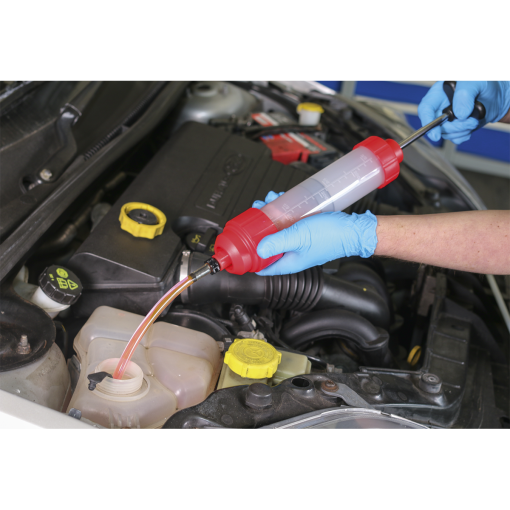 Multipurpose syringe with Viton® seal, ideal for the transfer of oils/fluids to and from vehicle components such as gearboxes and differentials. Translucent body allows easy inspection of oils and fluids.